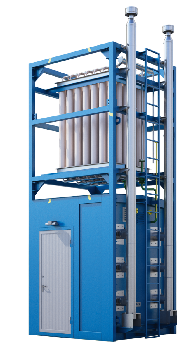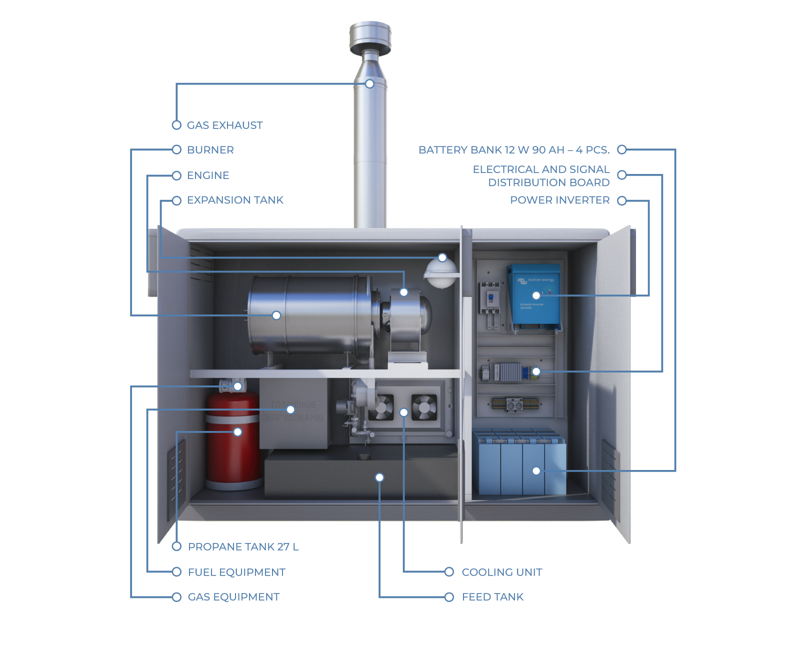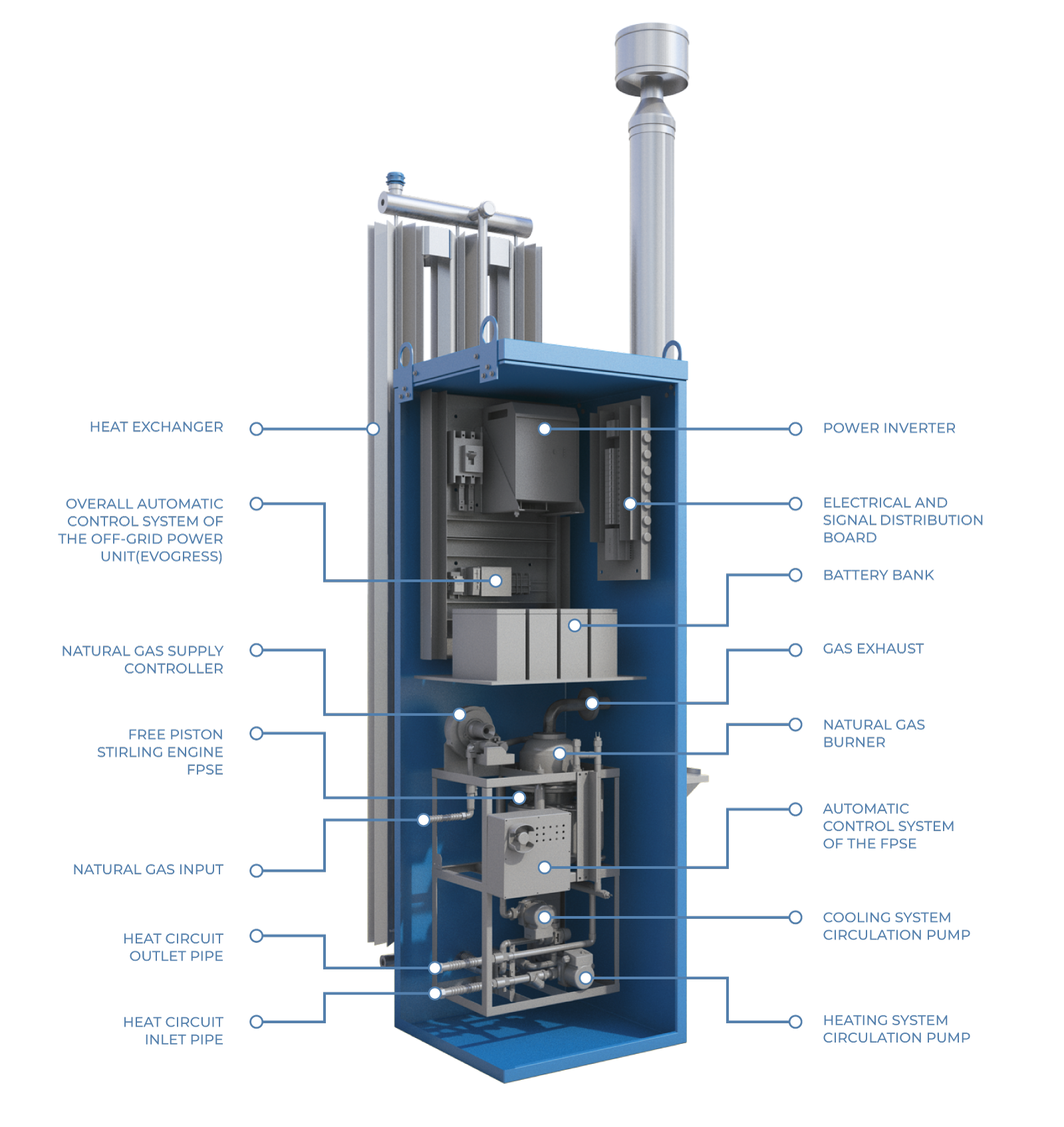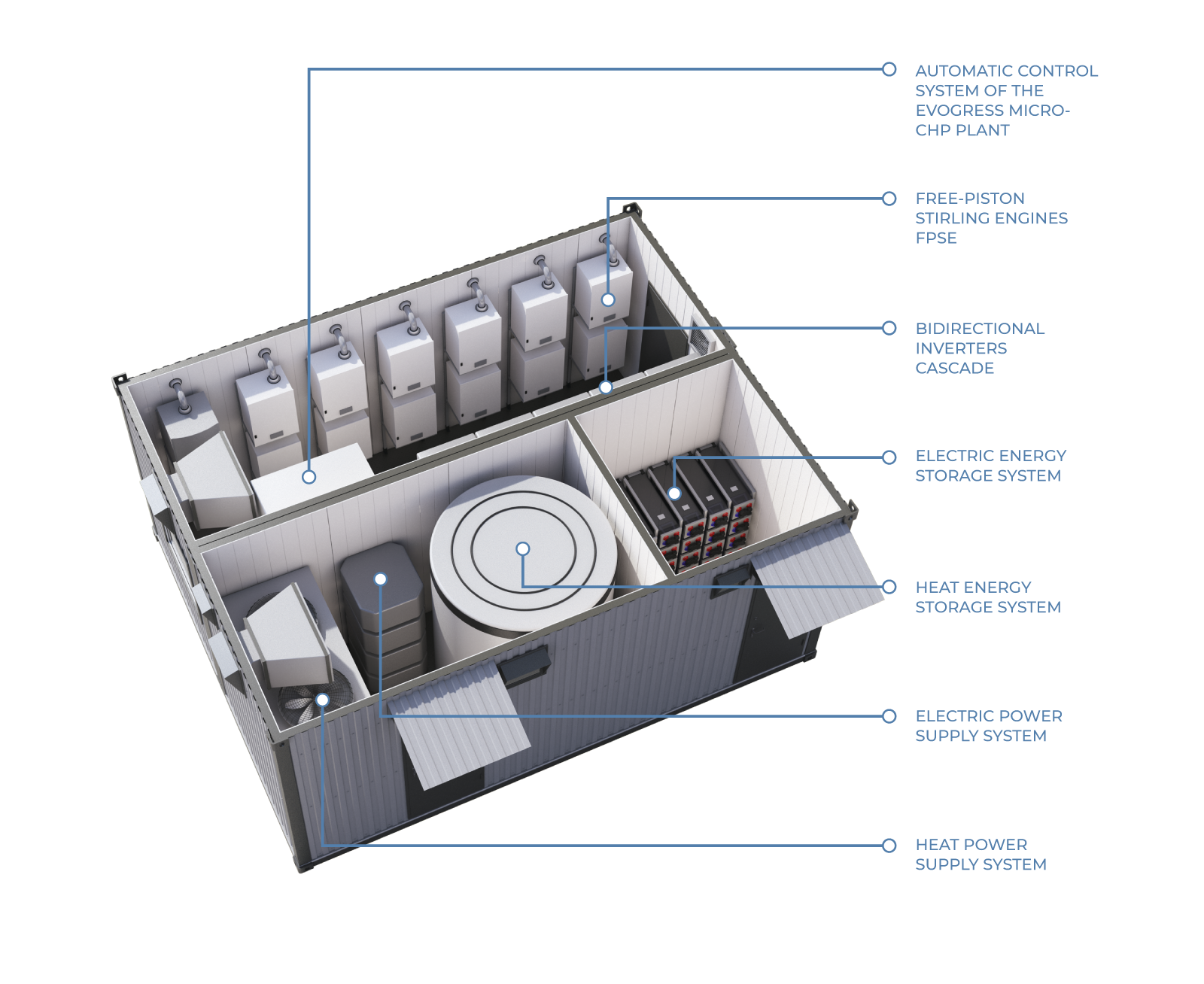 The multi-purpose facility with the integrated EVOGRESS off-grid power unit is able to operate on available local fuels (compressed natural gas, liquefied natural gas, diesel fuel, etc.), providing a long interval between refueling.